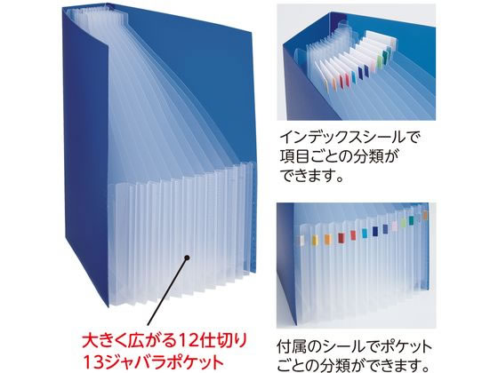大きく広がる12仕切り13ジャバラポケット付属のシールでポケットごとの分類ができます。